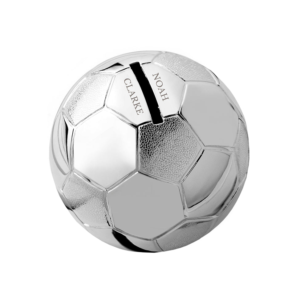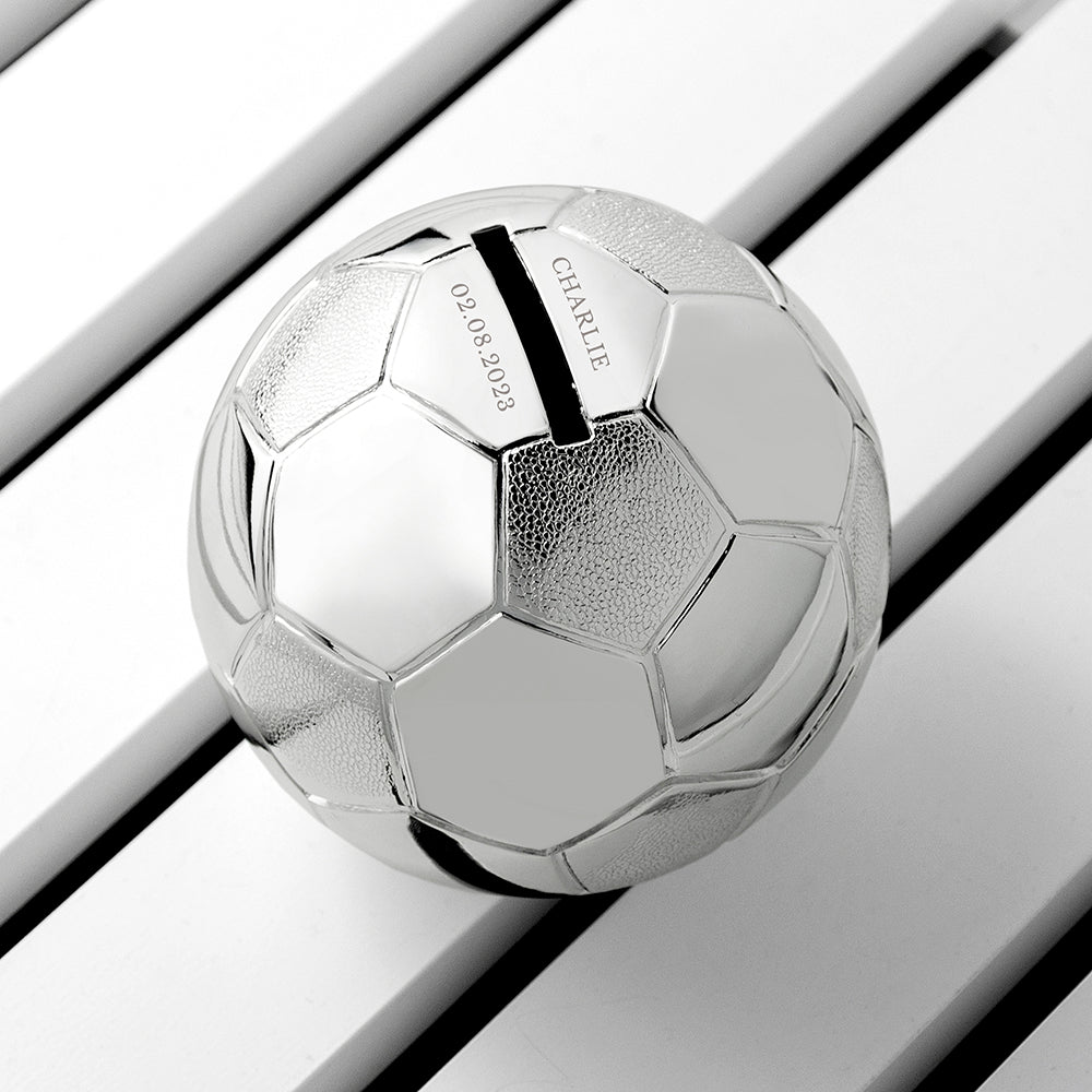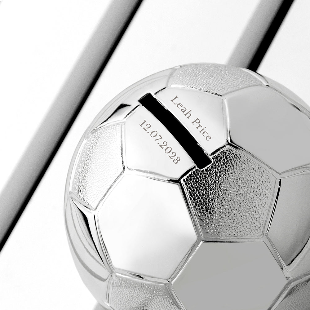Description Capture the memories of your little bambino by gifting them their own silver plated Football Money Box Personalise with: Their Name (max 20 characters) Personal Message (max 20 characters) Read more less Specifications 14cm x 3cm x 4.7cm: 14cm x 3cm x 4.7cm