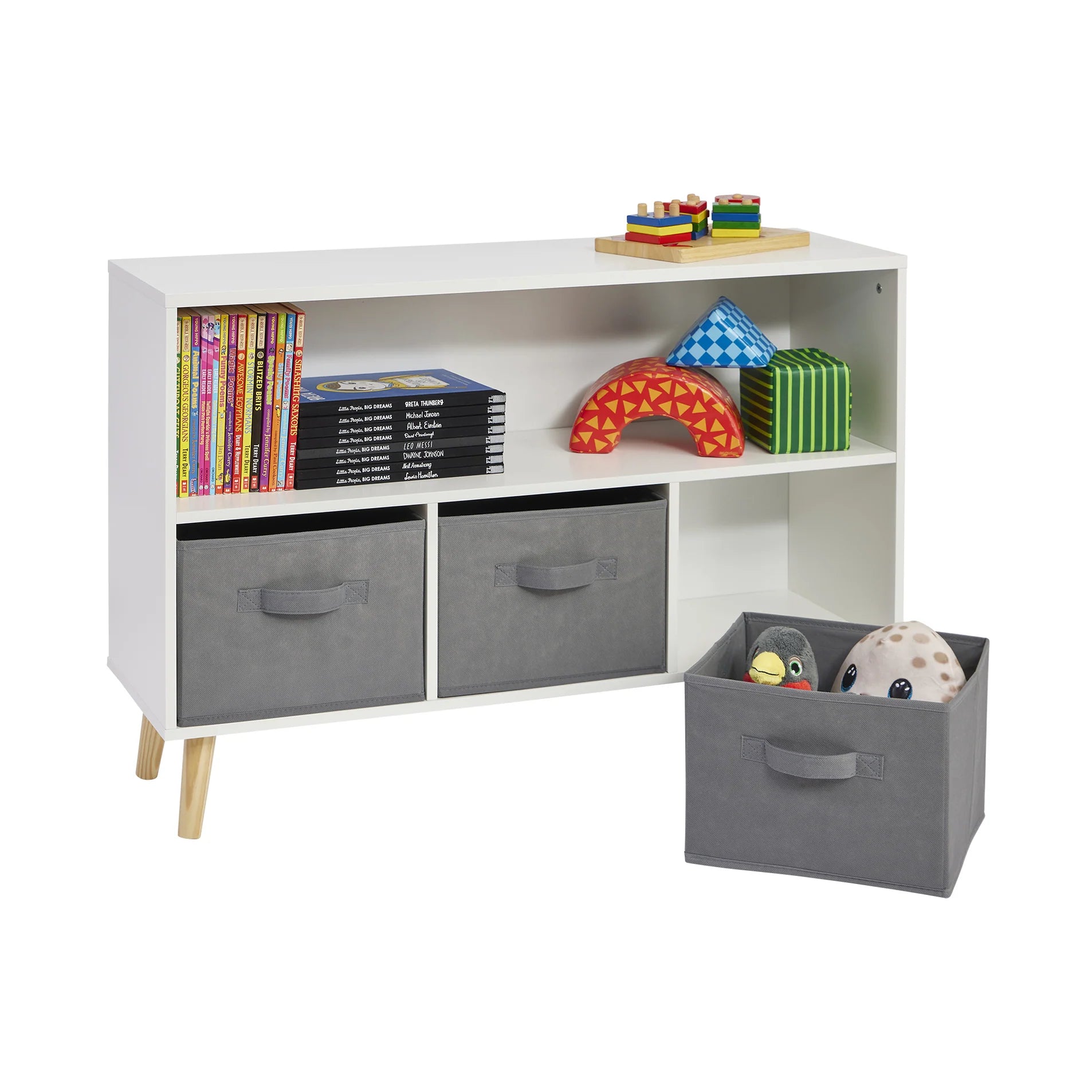 - With the open shelf they'll be able to see and access toys straight away.