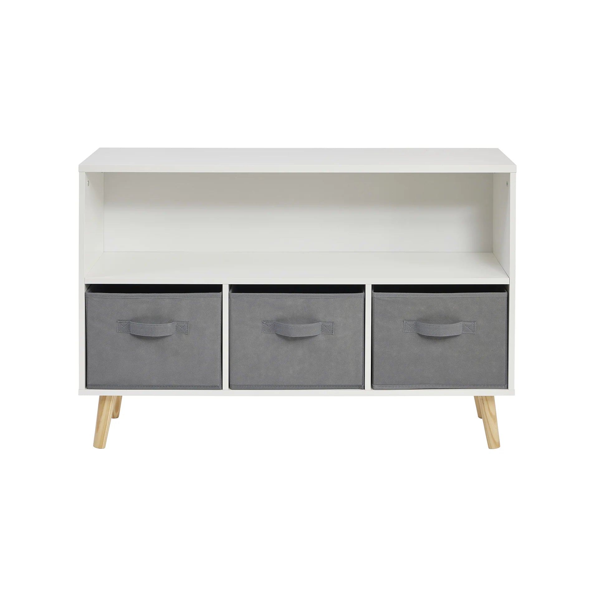 A white storage unit with open shelf and 3 grey storage baskets - perfect for storing your little one's toys and helping them to keep them tidy.