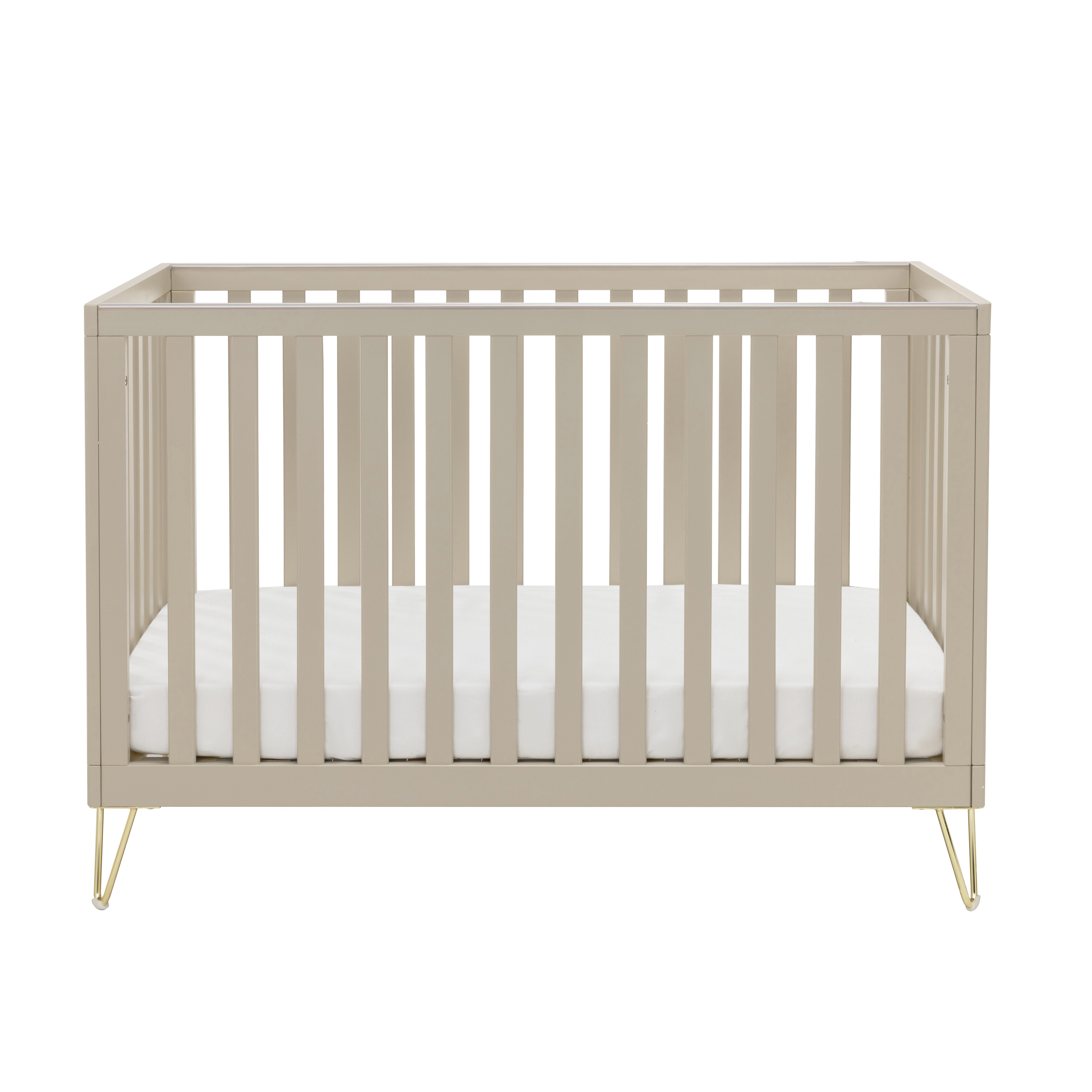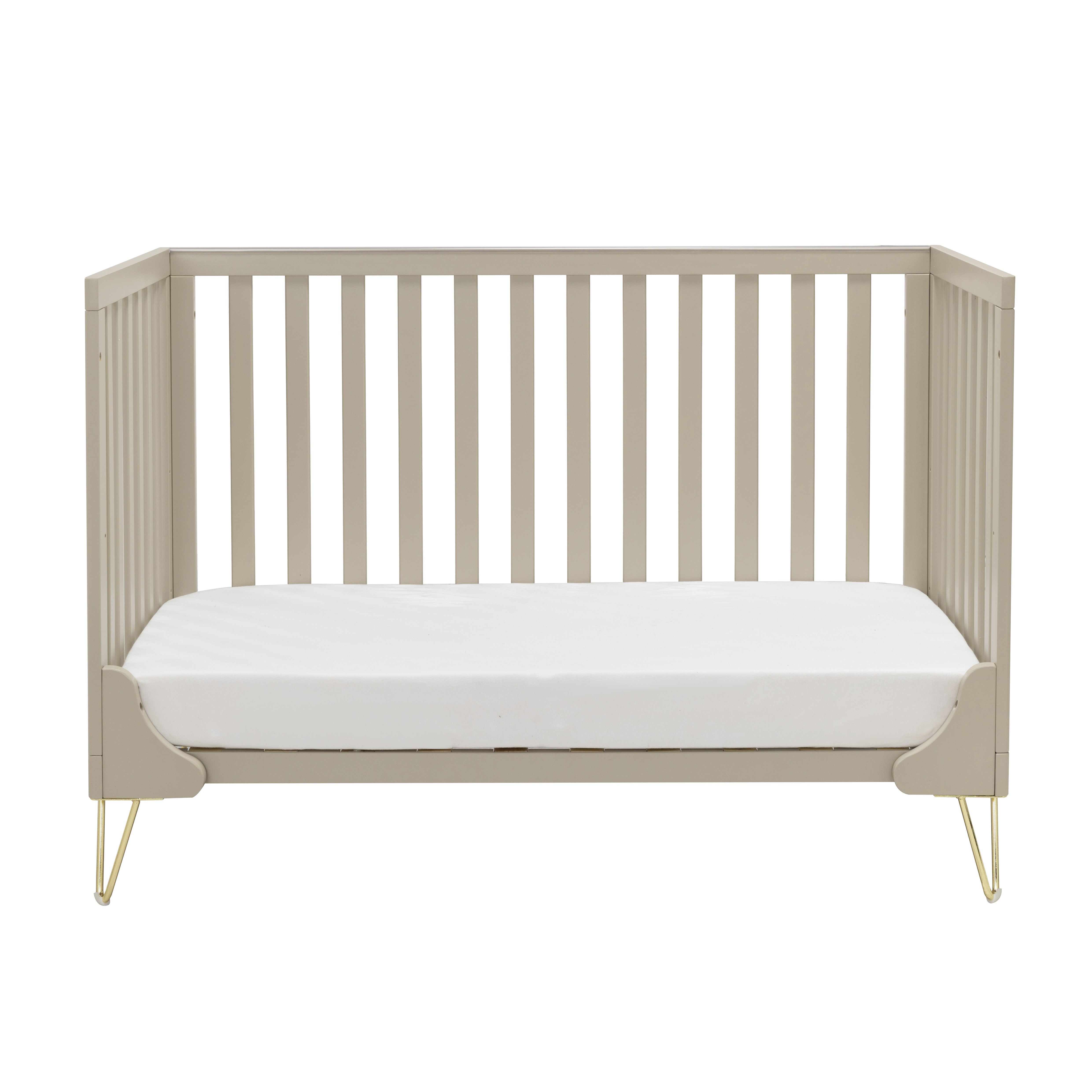 The stunning Babymore Kimi convertible cot bed will be the standout piece of furniture in any nursery. An exquisite combination of contemporary wooden style and retro hairpin legs blend seamlessly to provide a striking fashion statement. The all-around spindle design provides an airy, open feel that allows full visibility of your little one from any angle. The Kimi offers 3 adjustable mattress heights, teething rails, and can be transformed into a toddler bed, suitable from birth to 4 years old. The hairpin legs are made of high quality steel wire, stable, sturdy and durable, and come with floor protectors included.