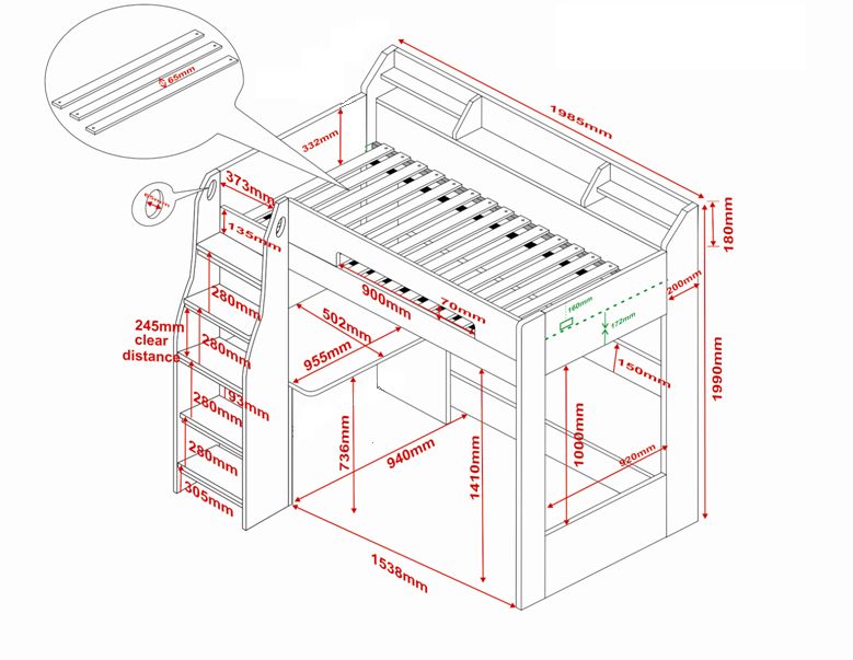 Length: 198.5cm x Width: 114 - 212.5cm (With L shaped bed) x Height: 199cm