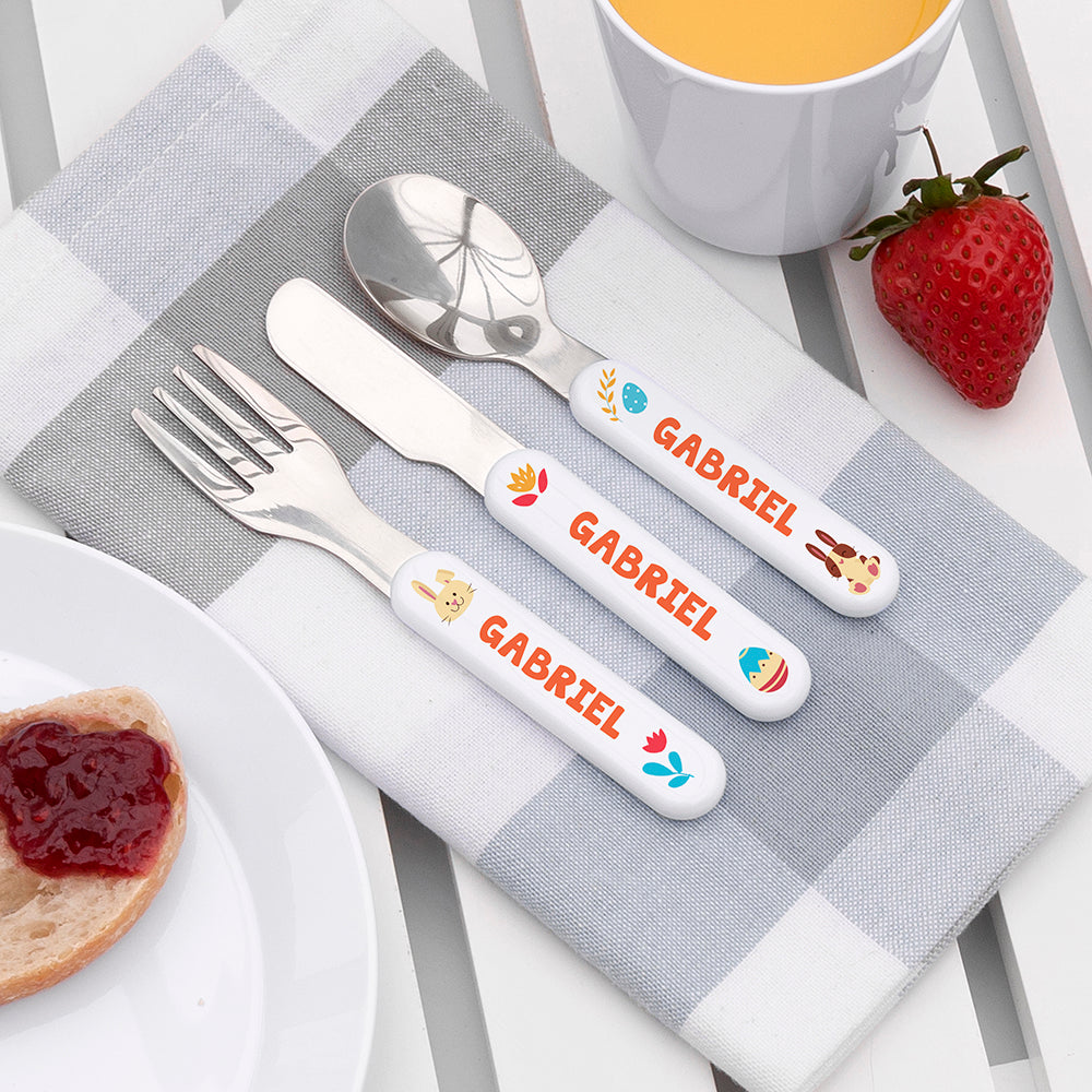 Description Give your little bambino their very own personalised cutlery set featuring a Bunny Rabbit with a spring theme. Add their name (max 12 characters) 3 Piece set includes: Knife, Fork and Spoon Read more less Specifications Fork 14cm x 2.4cm x 0.7cm | Knife 13.5cm x 1.7cm x 0.7cm | Spoon 13.5cm x 3.2cm x 0.7cm: Fork 14cm x 2.4cm x 0.7cm | Knife 13.5cm x 1.7cm x 0.7cm | Spoon 13.5cm x 3.2cm x 0.7cm