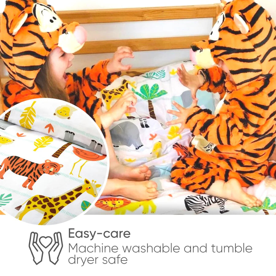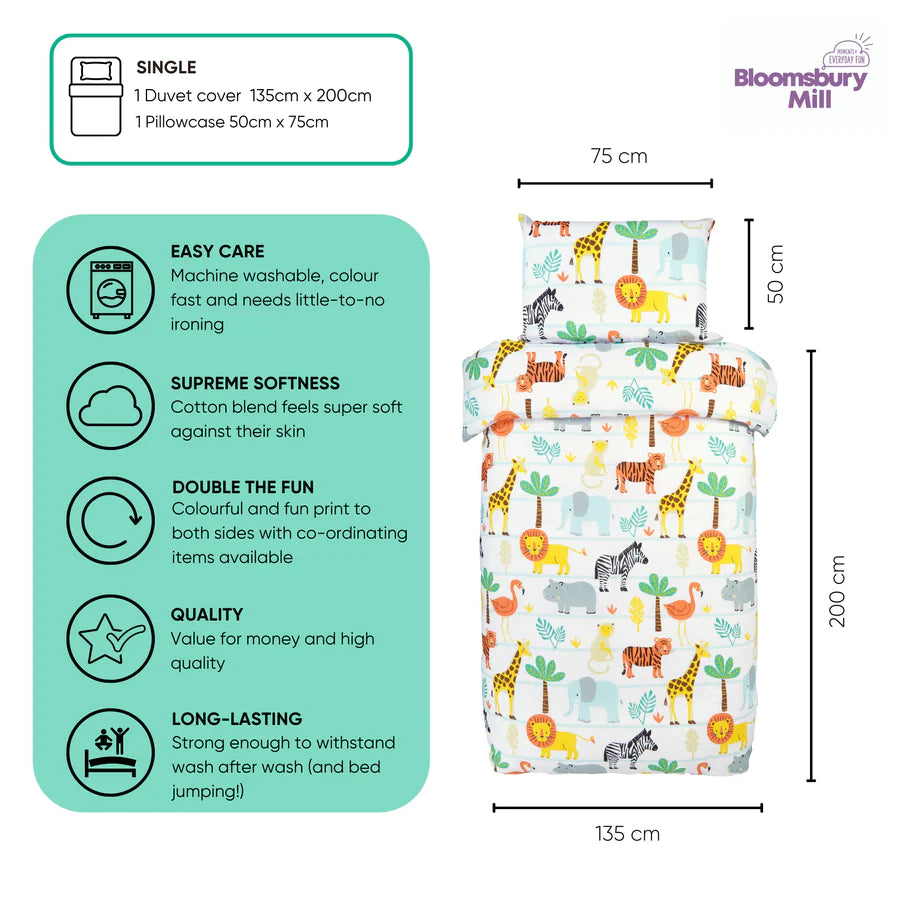 So your little one is ready to move on to their Single Bed but they still love their animals? This Single Duvet Set is full of Safari Adventures with a range of animals to keep them occupied as they settle to sleep.